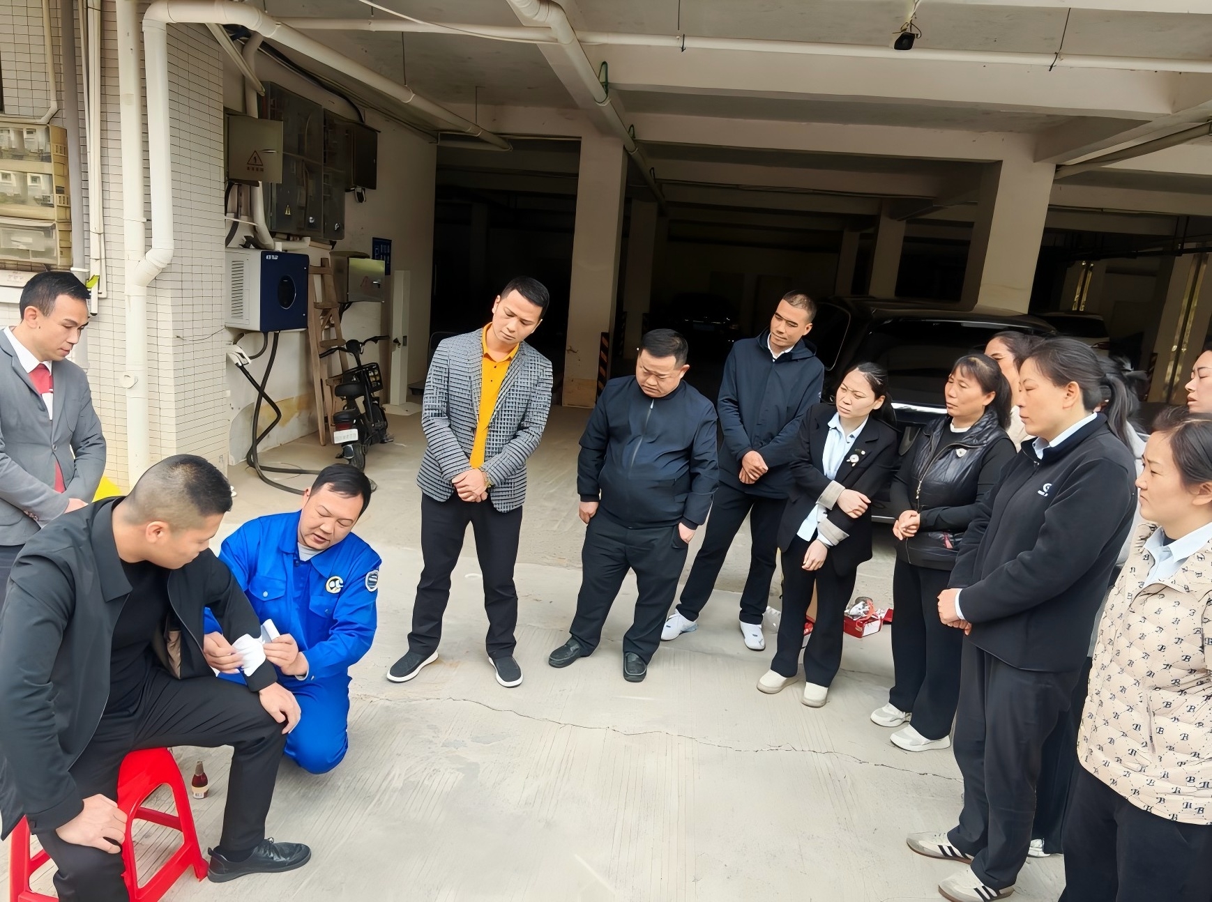 模擬茶水間突發(fā)火災(zāi),疑似電器使用不當(dāng)著火,火勢(shì)發(fā)展迅猛并產(chǎn)生大量濃煙,保潔員發(fā)現(xiàn)后大喊“著火了,著火了”,并且拉響消防警報(bào),接報(bào)后,相關(guān)人員使用滅火器撲救火災(zāi),并通知所有人員緊急撤離至安全地帶,最后進(jìn)行人員清點(diǎn)。