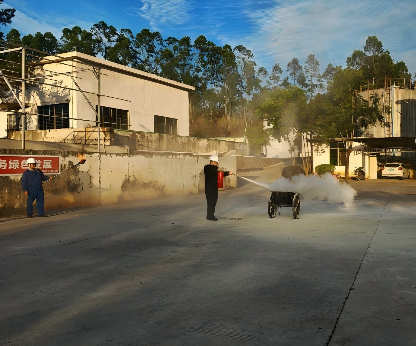 由指導(dǎo)員向大家講解使用滅火器及面罩的方法及注意事項(xiàng),并安排每人依次進(jìn)行滅火器滅火操作。